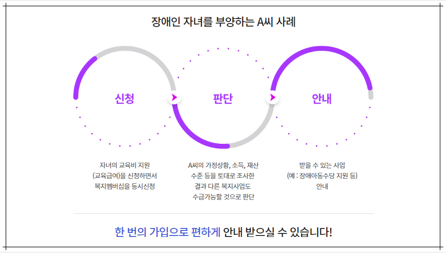 장애인 자녀를 부양하는 A씨의 경우, 교육급여와 복지멤버십(맞춤형 급여안내)을 신청하게 되면 A씨의 공적 자료를 기반으로 A씨의 가정상황, 소득과 재산 수준 등을 토대로 조사를 진행하며, 그에 따라 A씨가 받을 수 있는 교육급여 외의 복지사업(예, 장애아동수당지원) 을 확인하여 안내를 해줍니다. 이렇게 안내가 된다면 A씨는 교육비 지원(교육급여) 외에도 장애아동수당 지원에 대한 복지서비스를 알게 되고 신청하게 된다면 몰라서 받지 못하는 일은 발생하지 않겠죠?