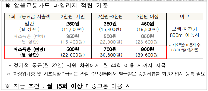 특히 이번 8월부터 연말까지 한시적으로 저소득층 마일리지는 추가 지원을 해주기에 대중교통을 이용한 저소득층의 경우 최대 50%까지 절감할 수 있습니다.