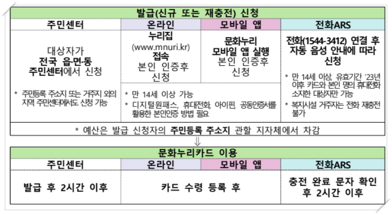 문화누리카드 앱 혹은 https://www.mnuri.kr/ 에 접속하신 후 발급자격 검증을 받고, 본인인증 후 신청하시면 등기우편으로 받으시거나 농협지점에서 방문수령 하실 수 있습니다.
