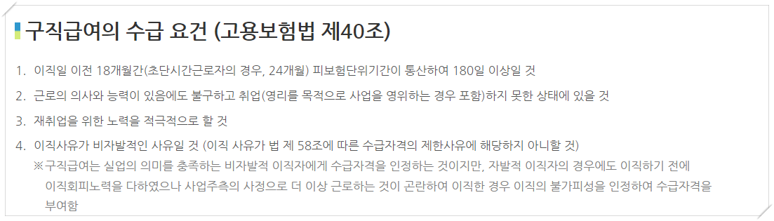 또한 비자발적인 퇴사 등의 사유가 있어야 하며, 재취업을 위해 적극적인 노력을 해야 합니다.