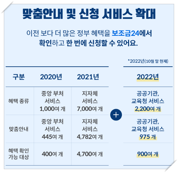 하지만 이번 2022년 10월말 현재 공공기관, 교육청 서비스의 약 900여건이 맞춤안내 서비스에 소속이 되어 전체 10,000여개의 맞춤안내를 보조금24에서 확인을 하실 수 있게 되었습니다.