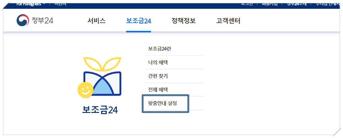 - 보조금24 > 맞춤안내 설정을 클릭합니다.