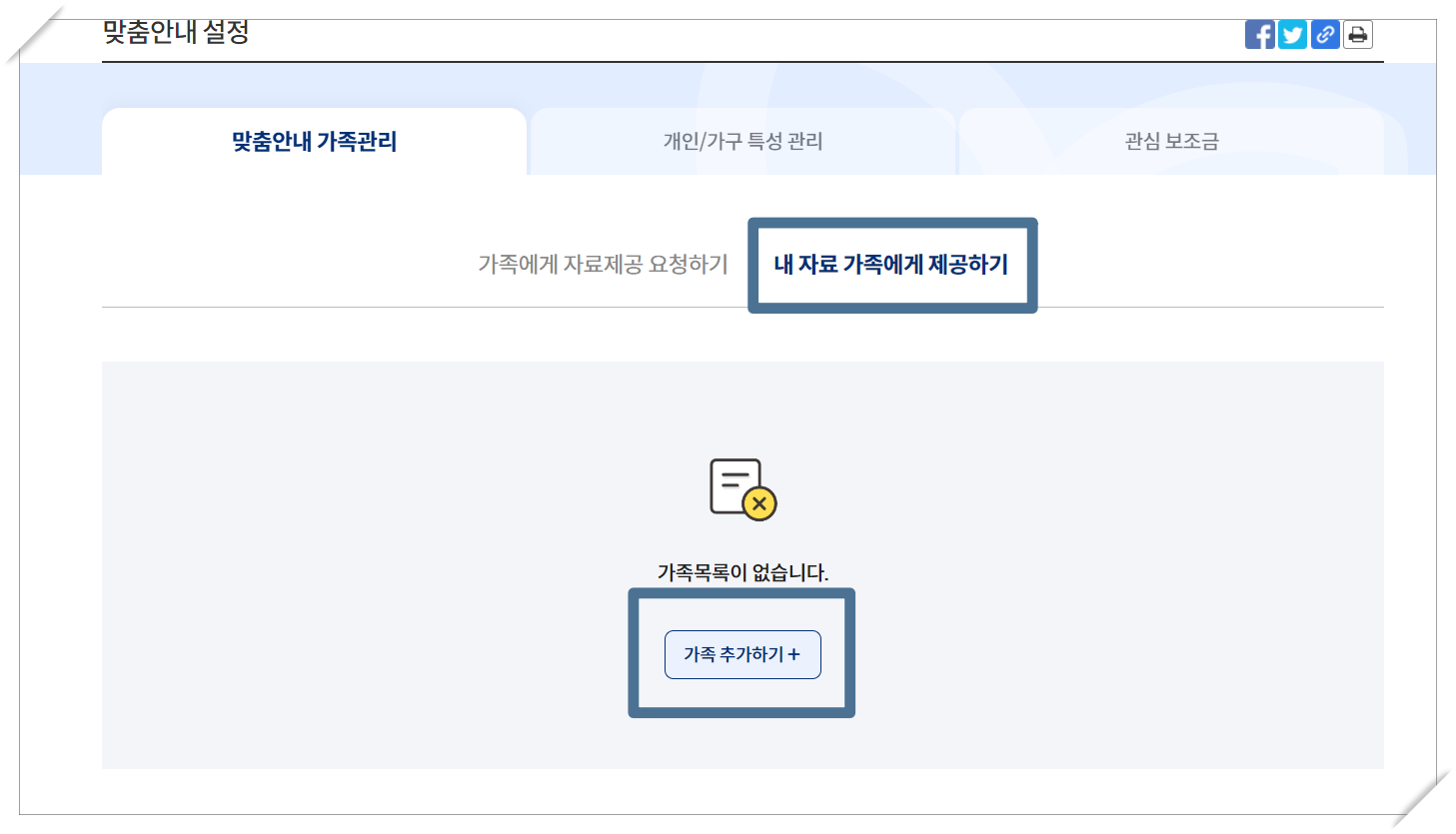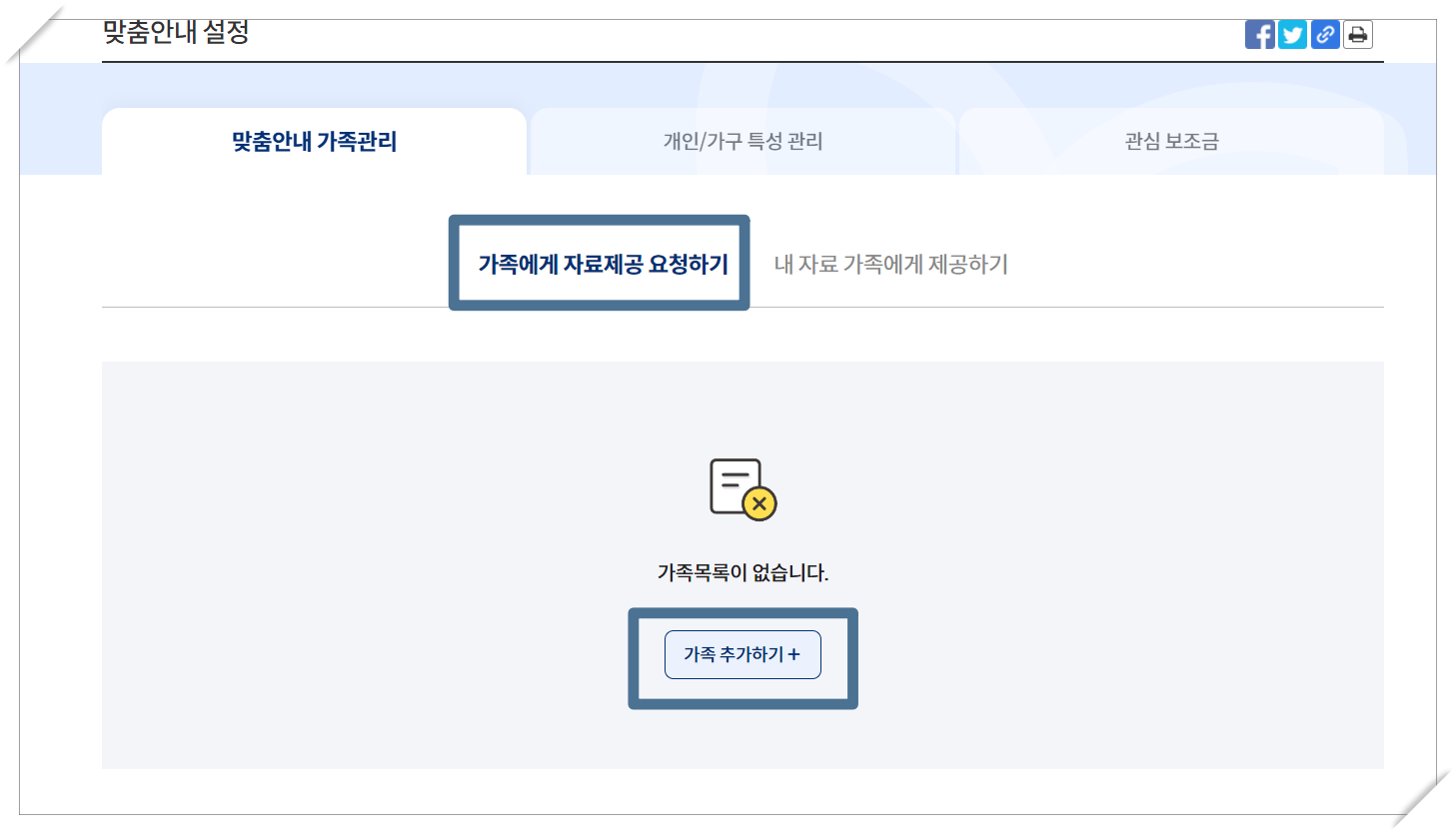 - 자녀분들의 경우 가족에게 자료제공 요청하기 에서 가족 추가하기를 눌러 부모님을 추가하셔야 합니다.