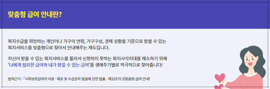 맞춤형 급여 안내란 복지수급을 희망하는 개인이나 가구의 연령, 가구구성, 경제 상황을 기준으로 받을 수 있는 복지서비스를 맞춤으로 찾아 안내를 해주는 제도를 말합니다.