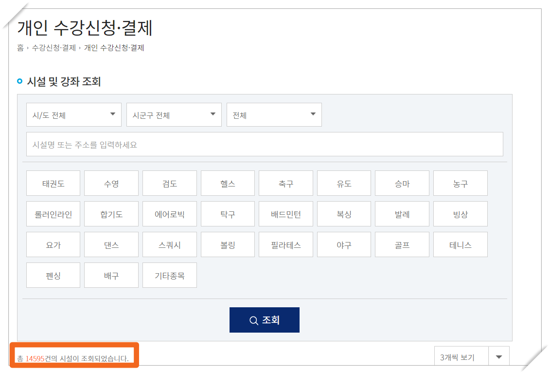 개인수강신청,결제 페이지에서 시설및 강좌를 조회해 보면 14000건이 넘는 시설이 조회가 됩니다.