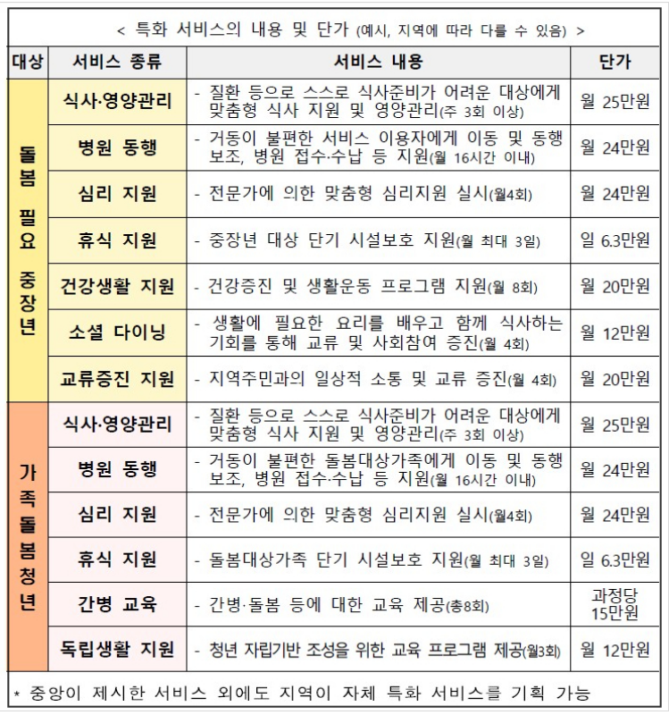 질병, 고립 등으로 돌봄이 필요한 중장년과 가족돌봄청년에게 돌봄, 가사, 병원동행, 심리지원 등을 통합제공하여 일상생활의 어려움을 해소하는 서비스 입니다.