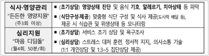 - 식사,영양관리 : 스스로 식사 준비가 어려운 돌봄 필요 중장년, 가사부담이 큰 가족돌봄청년 및 돌봄 대상자에게 식사 및 영양관리를 지원하여 줍니다.