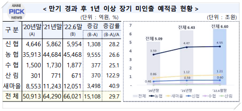 보통 어르신들의 경우 거주하고 계시는 농협이나, 축협, 수협 등을 많이들 이용하시는데 이러한 상호금융조합에서 장기 미인출한 예금과 적금이 22년말 6월 6.6조원이 된다고 합니다. 20년말 대비 1.5조원이 증가한 추세인데요.
