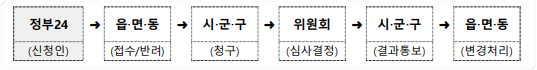 정부24 누리집에서 변경 신청을 검색하여 신청을 하면 읍,면,동 담당자가 확인하여 시,군,구를 거쳐 위원회가 최종 심사하여 결과를 통보합니다.