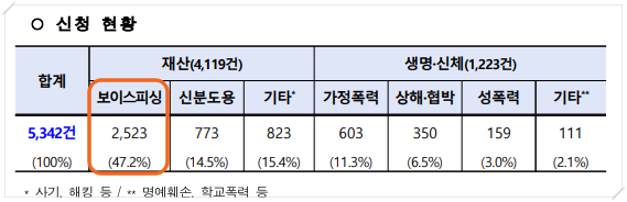 2017년 위월회 출범한 이후 5년동안 총 5,342건 중 4,750건의 주민등록번호 변경을 의결하였으며 피해 유형별로는 전화사기(보이스피싱)가 전체 신청 건 중 2,523건(47.2%)으로 절반 가까운 비율을 차지했습니다.