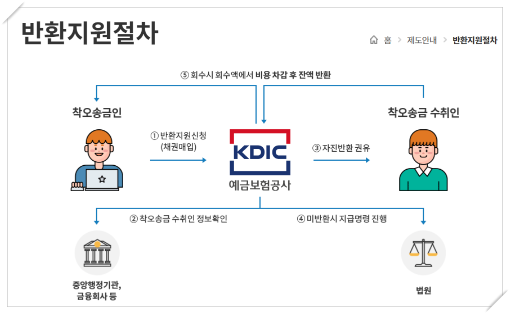 착오송금인이 금융회사를 통해 반환신청을 한 이후 수취인이 반환신청을 불응할 경우 착오송금인은 예금보험공사에 착오송금반환신청을 합니다.