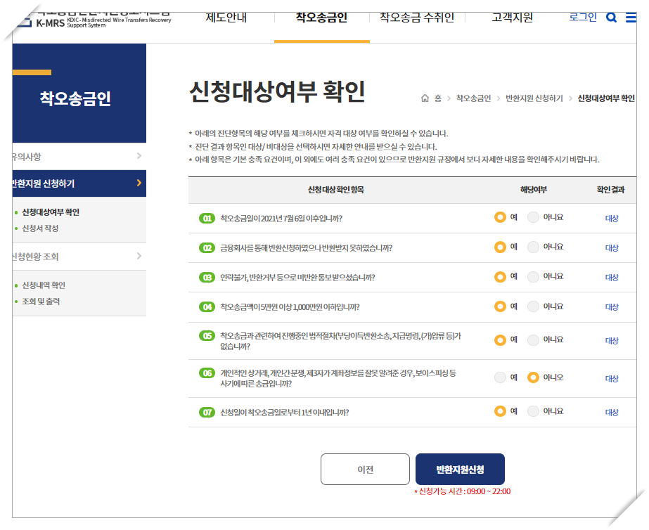 착오송금일이 21년 7월 6일 이후에만 신청 대상이 되며, 그 이전에 착오송금을 하셨다면 대상이 되지 않습니다.
