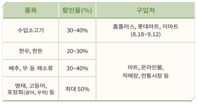 홈플러스, 롯데마트, 이마트에서는 수입소고기를 30~40%할인을 하며, 마트와 온라인몰, 직매장, 전통시장 등에서는 한우, 한돈, 배추, 무 등의 채소류, 명태, 고등어, 포장회(광어, 우럭)등 최대 50% 할인을 적용합니다.