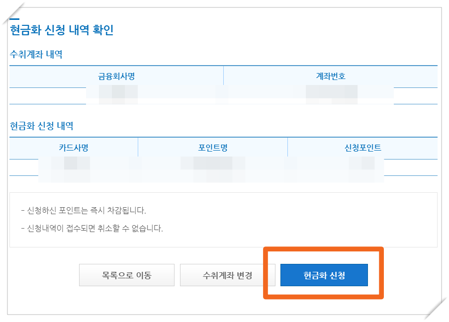 6. 현금화 신청 내역 확인하고 [현금화 신청]을 누르면 됩니다.