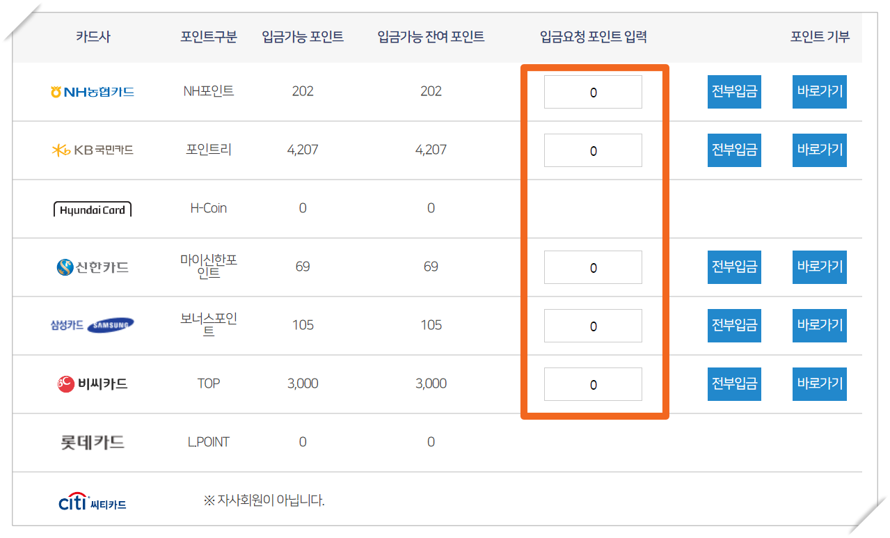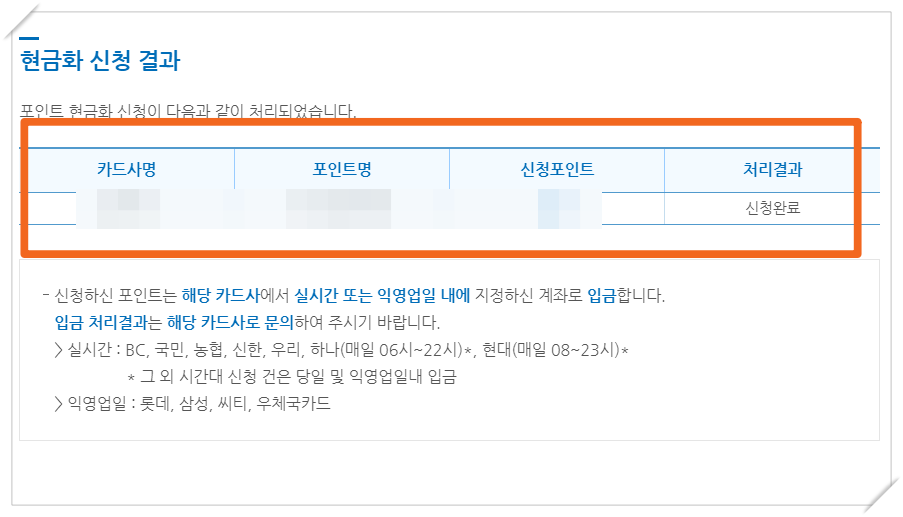 계좌입금 포인트 신청은 비씨카드, 신한카드, 우리카드, KB국민카드, NH농협카드는 실시간으로 입금을 받을 수 있으며, 삼성카드, 씨티카드, 우체국, 롯데카드는 익영업일 입금을 받으실 수 있습니다.