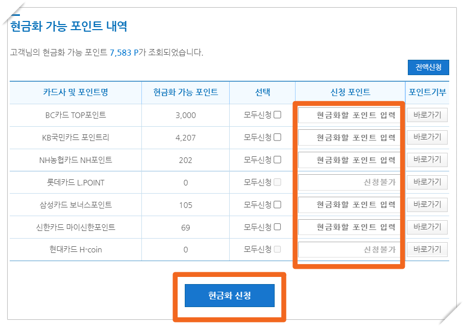 4. 자신이 현금화 하기를 원하는 카드포인트를 입력 후 [현금화 신청]을 누릅니다