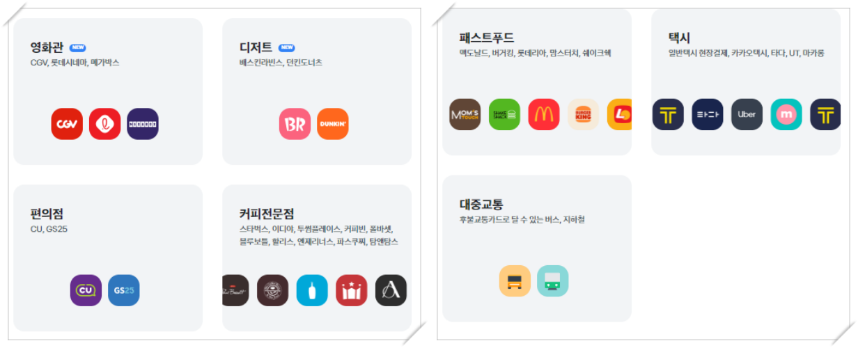 혜택을 받을 수 있는 영역은 영화관, 디저트, 편의점, 커피전문점, 패스트푸드점, 택시, 대중교통으로 나누어 볼 수 있습니다.