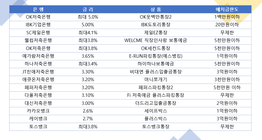 1금융권 보다는 제2금융권과 같은 저축은행이나 인터넷 은행에서 파킹통장 상품을 보유하고 있으며, 보통 3% 이상의 금리를 주고 있습니다.