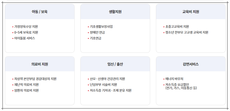 혹시 지금까지 몰라서 내가 못받고 있던 복지정책은 없는지, 보조금은 없는지 이번 기회에 확인하셔서 나에게 주어진 혜택을 모두 받으시는 기회가 되셨으면 좋겠습니다
