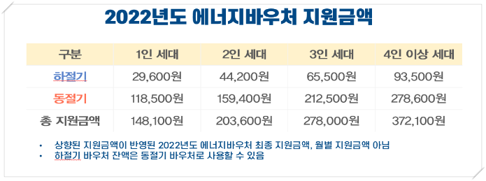 에너지가격이 상승됨에 따라 에너지 취약계층의 비용 부담경감을 위해 22년 동절기 에너지바우처 지원사업의 지원금액이 인상이 되었습니다.