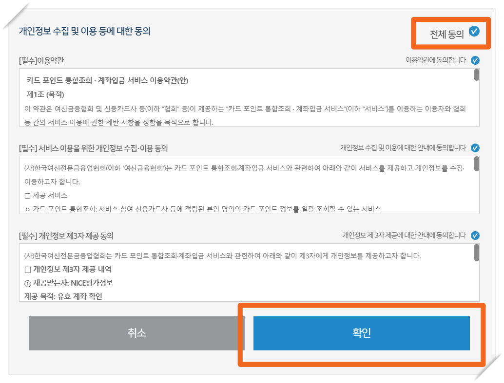 3. 로그인을 하신 후 [상기 내용을 모두 확인하였습니다]에 체크하시고 카드포인트 [조회하기]를 누릅니다