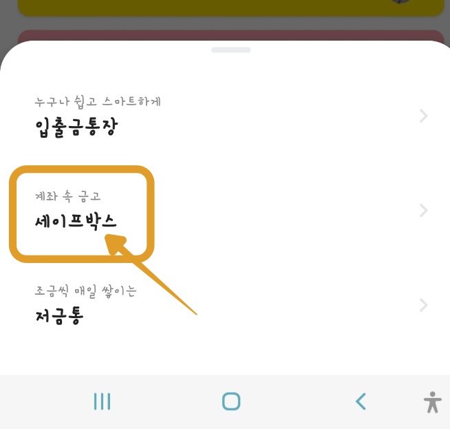 2. 개설할 수 있는 입출금통장, 세이프박스, 저금통 중 하나를 선택할 수 있는 팝업창이 뜹니다.